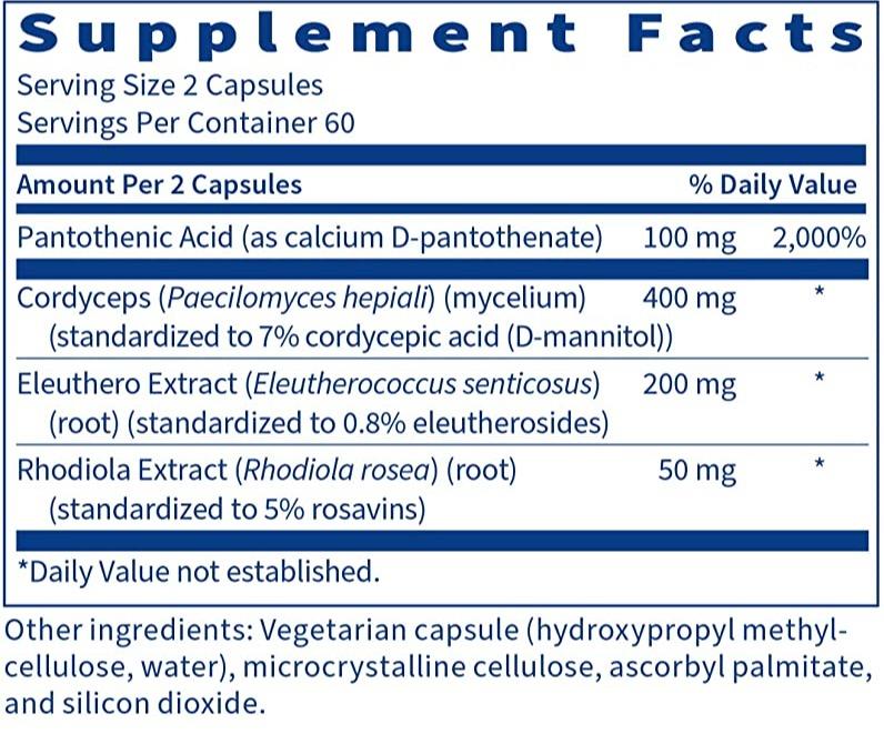 Eleuthero, Rhodiola, and Cordyceps mushrooms have long been used in traditional medicine for their adaptogenic actions, assisting your adrenal glands and the hypothalamic-pituitary-adrenal axis (HPA-axis) to respond to various types of physiological stress. Together with pantothenic acid (vitamin B5), these adaptogens can help your body maintain a state of balance.